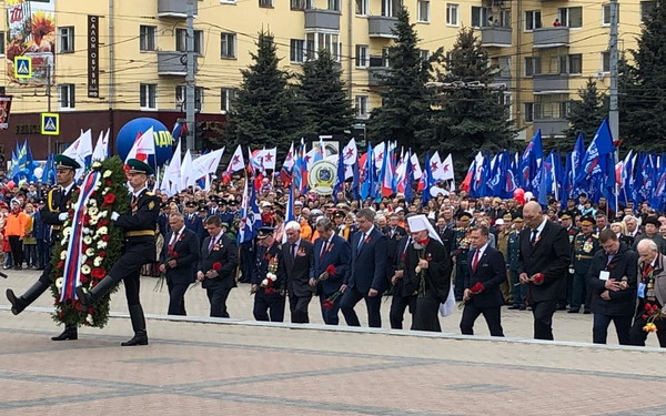 Перед началом митинга цветы возлагают к Вечному огню губернатор Александр Богомаз, председатель областной Думы Владимир Попков, Герой СССР Иван Кашин, Герой России Андрей Постоялко, а также глава польского города Конин Пётр Корытковски. На площадь выносят копию Знамени Победы и государственный Флаг России. Главный федеральный инспектор Андрей Дьячук отметил важность сохранения исторической памяти. Всех поздравил с праздником президент города Конина республики Польша — побратима Брянска Пётр Коротковски. 6+