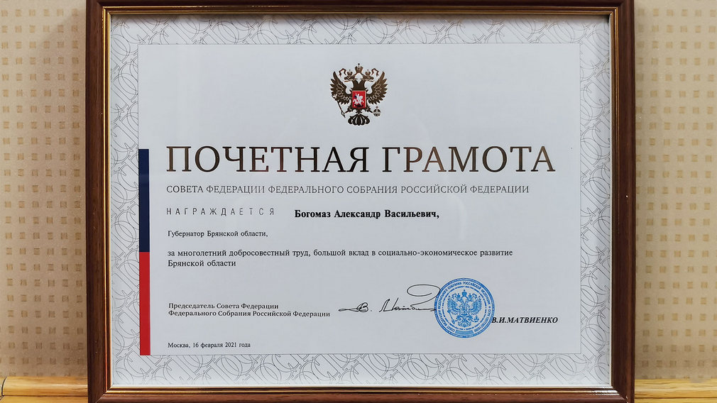 Как сообщает РИА » Стрела», почетную грамоту губернатору Брянщины вручила сенатор Галина Солодун. Эту награду А.В.Богомаз получил за многолетний добросовестный труд и большой вклад в социально-экономическое развитие Брянской области.В пресс-службе областного правительства рассказали, что награждение состоялось на заседании Брянской облдумы.