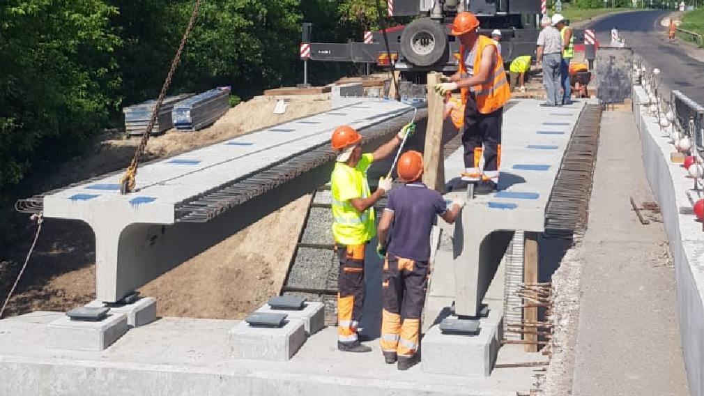 На объекте специалисты подрядной организации ООО «Дорстрой 32» приступили к монтажу балок пролетного строения. Протяженность подходов к мосту составляет 370 м, длина самого моста составляет 65 м.