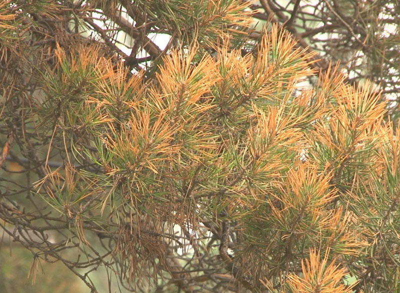 В парке насчитали около десятка пожелтевших сосен. Скорее всего они поражены каким-то заболеванием.