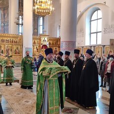 После Божественной литургии был совершен молебен у раки с мощами святого преподобного Олега Брянского и Крестный ход вокруг собора.