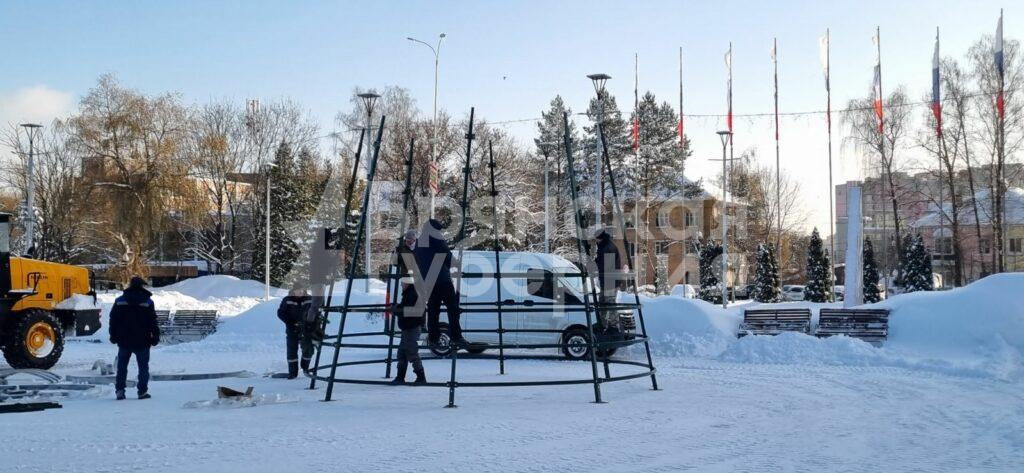 Рабочие расчищают площадку и монтируют каркас елки. Украсят её гирляндами и игрушками. От живой в этом году решили отказаться.