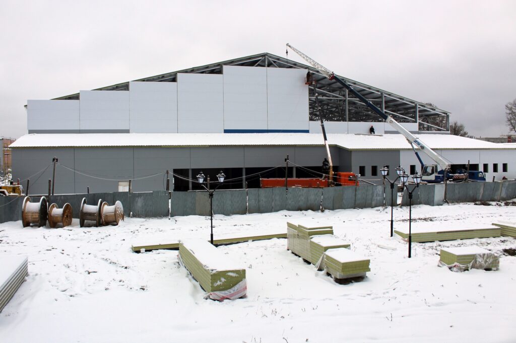 Подрядная организация ООО «РУССТРОЙ» выполнила свайный фундамент, ростверки на него, работы по устройству теплотрассы и ливневки. В настоящее время ведется монтаж металлоконструкций и кровельных сэндвич-панелей.