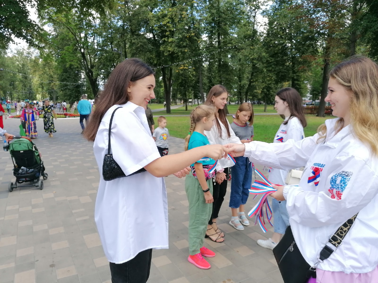 Брянская молодежь дарит праздничное настроение каждому жителю. Молодогвардейцы, юнармейцы и волонтеры вручают ленточки с триколором прохожим на улицах города.