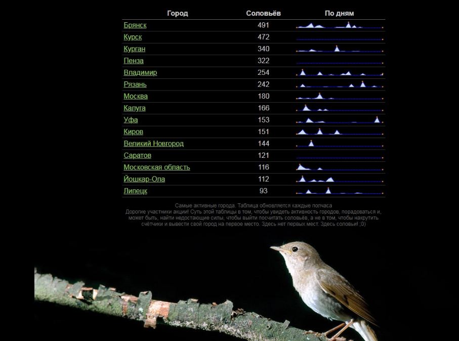 Как сообщает «Брянская губерния», природоохранная акция «Соловьиные вечера-2022» подходит к концу. Брянская область занимает первое место по количеству учтённых мест птичьего пения: 491 точку нанесли на карту трелей.