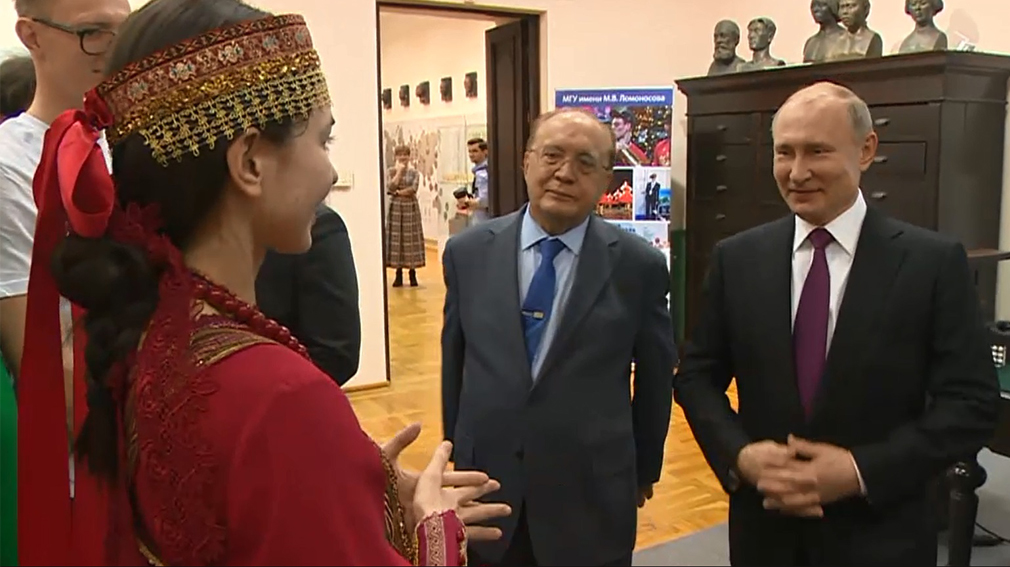 В преддверии Дня студентов Владимир Путин посетил историческое здание МГУ имени М.В.Ломоносова на Моховой улице. Здесь Президент РФ встретился со студентами, которые представили ему проекты цифрового культурно-образовательного центра и Всероссийского театрального фестиваля. В честь Года театра одна из студенток спела В.В. Путину куплет фольклорной песни Брянской области, которым он остался доволен.(0+)