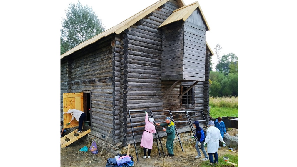 Работы ведутся в рамках федерального проекта «Творческие люди» нацпроекта «Культура». Уже обработали спецпокрытием стены, двери, лестницу к мельнице и на входе, расчистили место для установки нового водяного колеса, изготовили декоративный плетень и др.