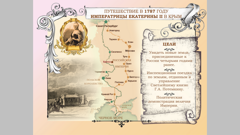 По пути в Крым Великая Императрица посетила Брянский край. Она побывала в городах Новое Место и Стародуб, посетила слободу Зыбкую. Местные жители запомнили Екатерину Великую как щедрого и добросердечного правителя. В Крыму высокую гостью ждал Григорий Александрович Потёмкин. За присоединение Крыма ему пожаловали титул князя Таврического.