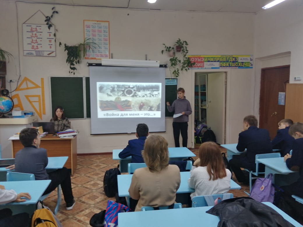 Для учащихся 8 класса школы №4 им. С.П. Лоскутова прошел час-диалог «Война для меня – это…», посвященный событиям Великой Отечественной войны, героизму и подвигу защитников Родины прошлого и нынешнего времени.