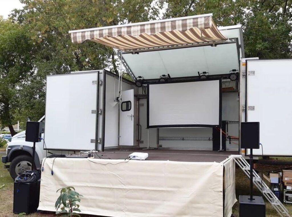 В автоклубе предусмотрена раздвижная сцена, экран, световое и звуковое оборудование, места для перевозки артистов и даже для рассадки зрителей.
