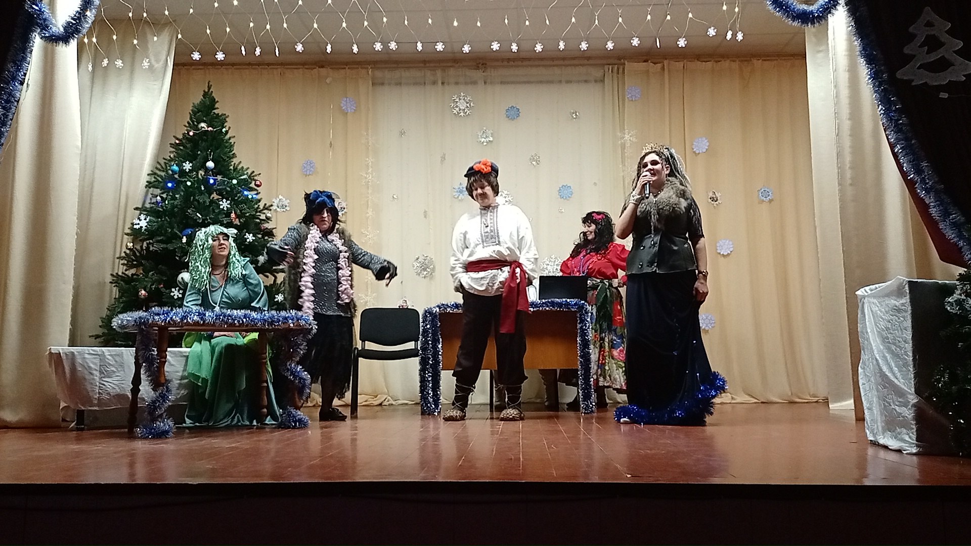 Театрализованное представление проходило в празднично украшенном зрительном зале и красавица- ёлка радовала всех своим новогодним убранством. В зале царила атмосфера хорошего настроения. Участники представления