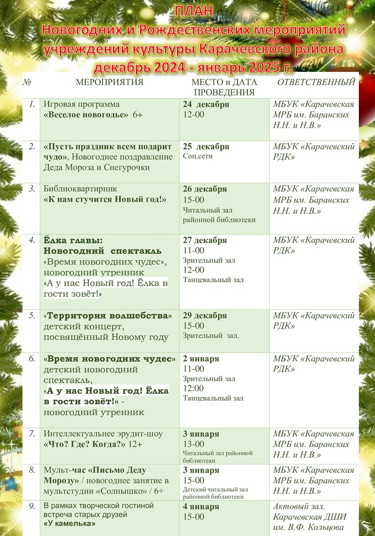 В течение новогодних выходных жителей Карачевского района ожидают разнообразные праздничные мероприятия, которые подготовили учреждения культуры.