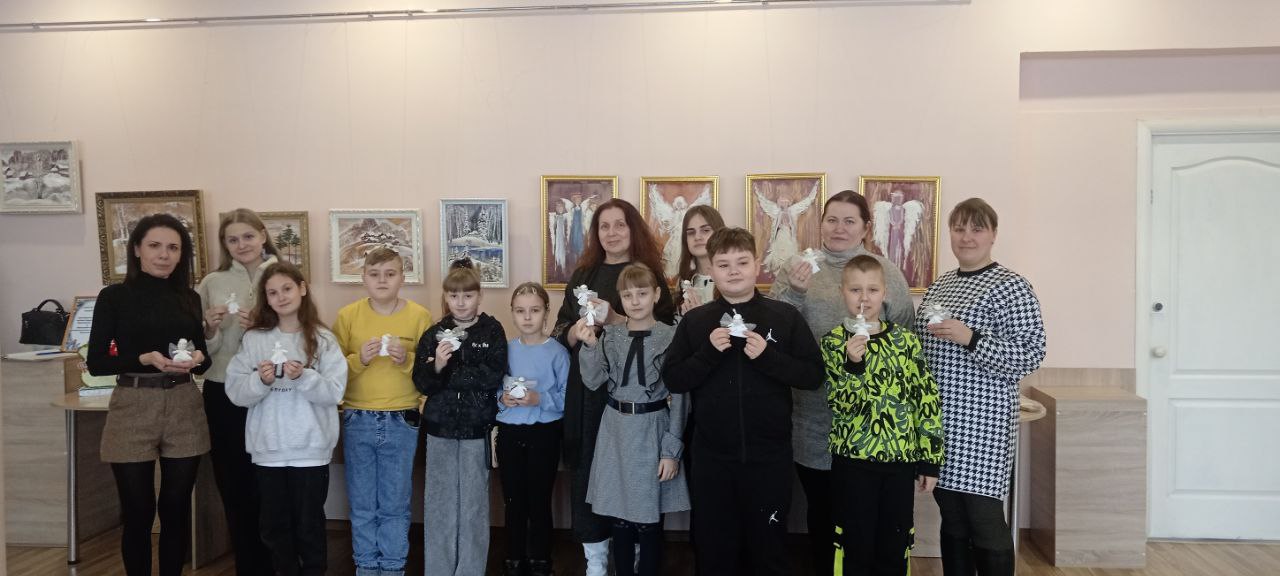 В дни зимних каникул на занятие пришли воспитанники Образцового вокального коллектива «Глория» вместе с руководителем Олесей Чирковой и учащиеся 4 «в» класса СОШ им. С.М.Кирова (учитель Ольга Вячеславовна Артюхова). Несложная технология изготовления, фантазия, усидчивость ребят — и в руках мальчишек и девчонок оказался замечательный ангелочек, от которого