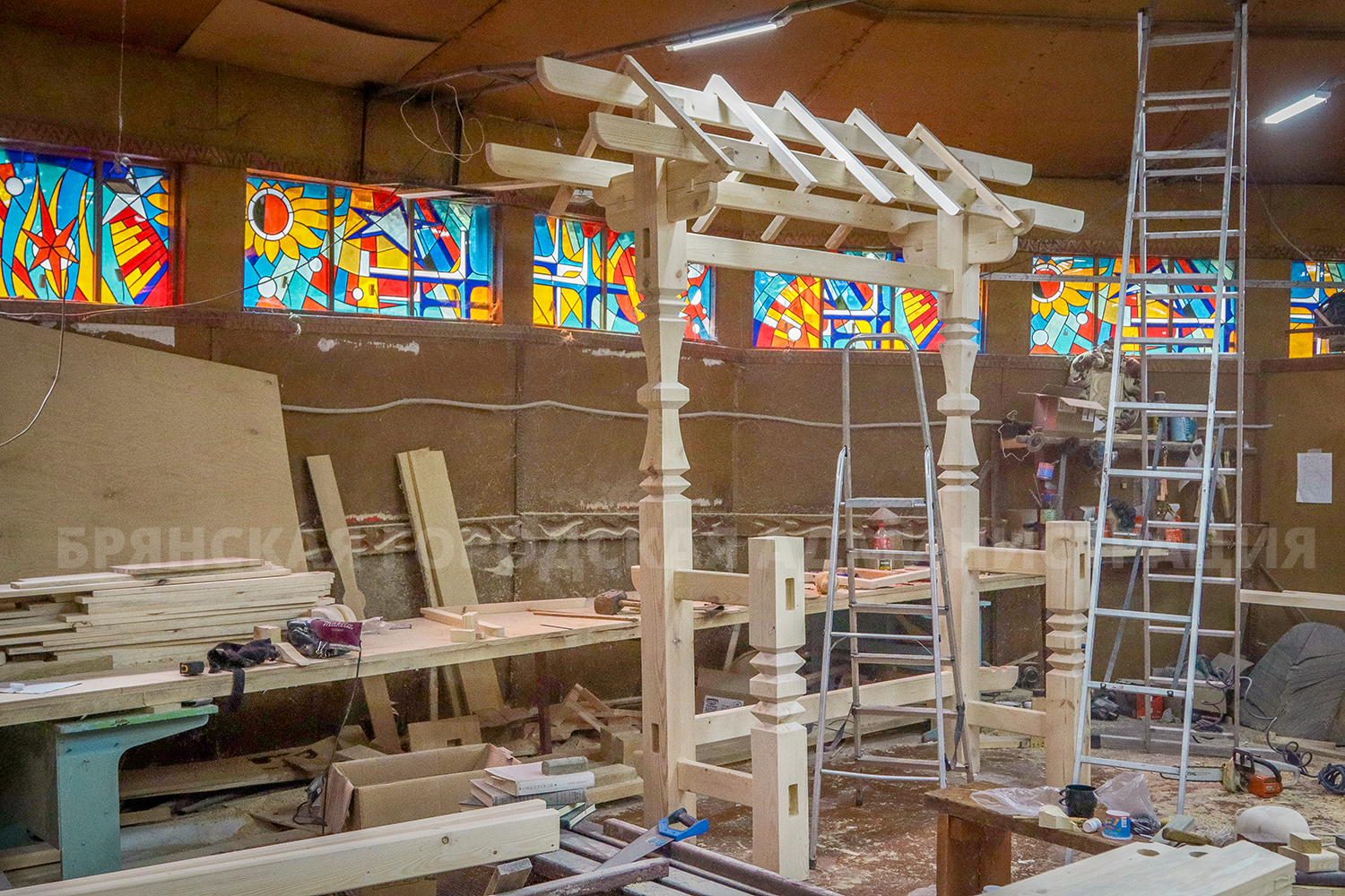 Идея украсить вход в парк резным информационным стендом принадлежит скульптору Андрею Вишневскому, который реализовал её в местной мастерской. Стенд изготовлен из высушенной сосны и обработан террасным маслом для долговечности и эстетичности.