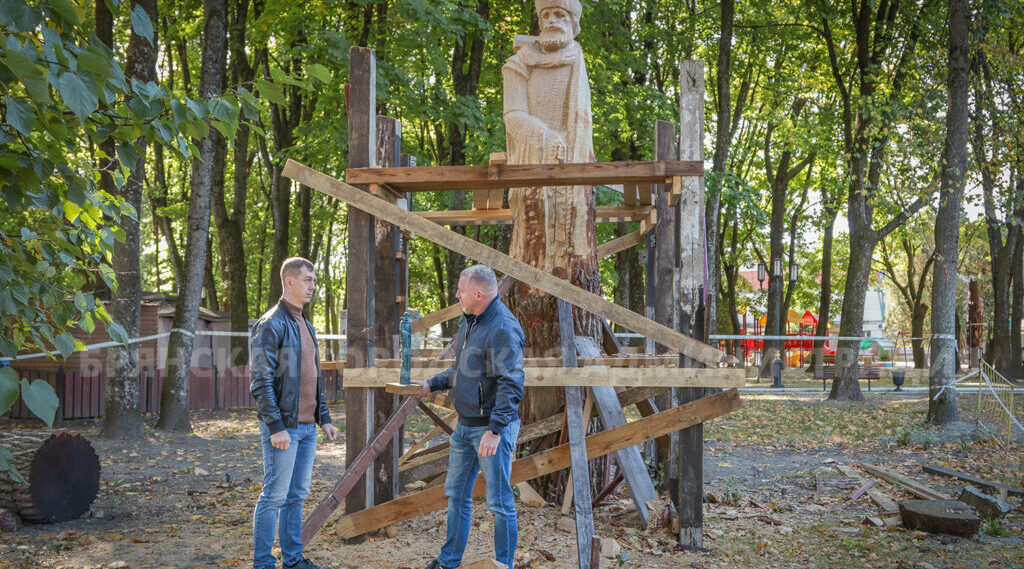 В брянском парке имени Алексея Толстого продолжается работа над новой деревянной скульптурой князя Романа Брянского.