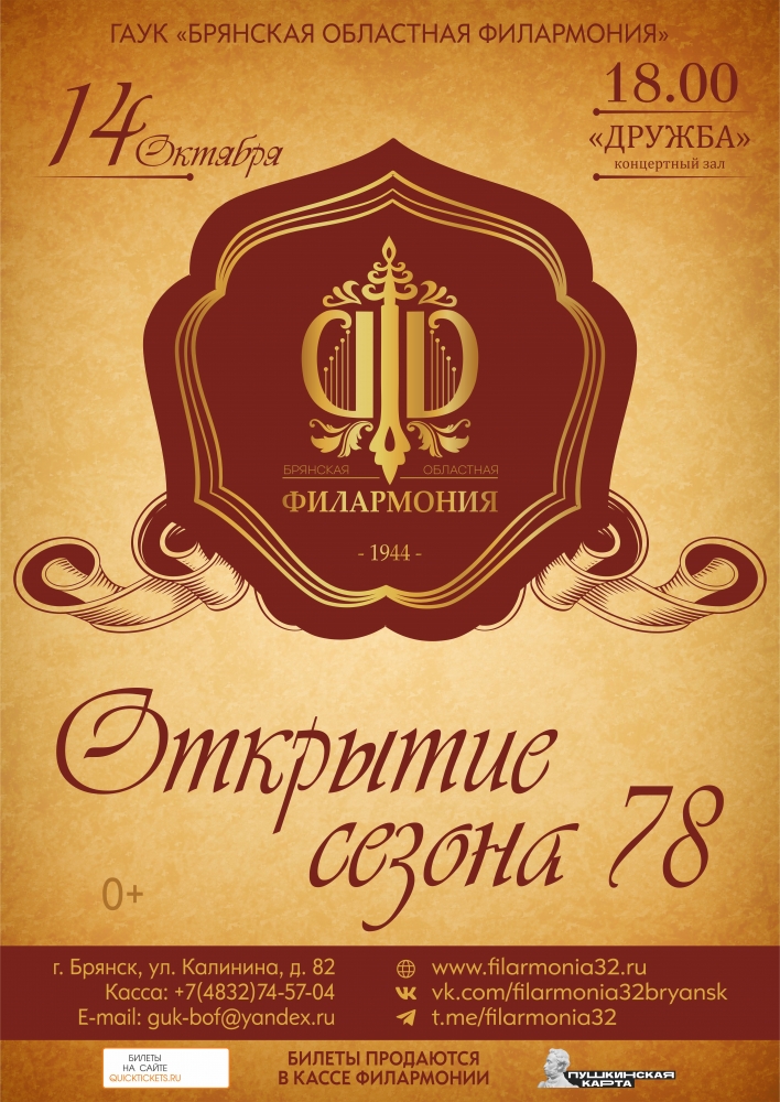 Открытие нового 78-го сезона Брянской областной филармонии состоится 14 октября в концертном зале «Дружба». Об этом сообщает «Брянская губерния».