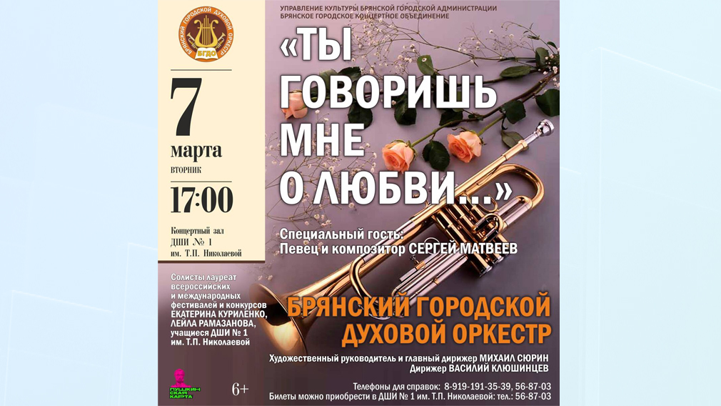 Брянский городской духовой оркестр под управлением заслуженного работника культуры Брянской области Михаила Сюрина приглашает на концерт, посвященный 8 Марта.