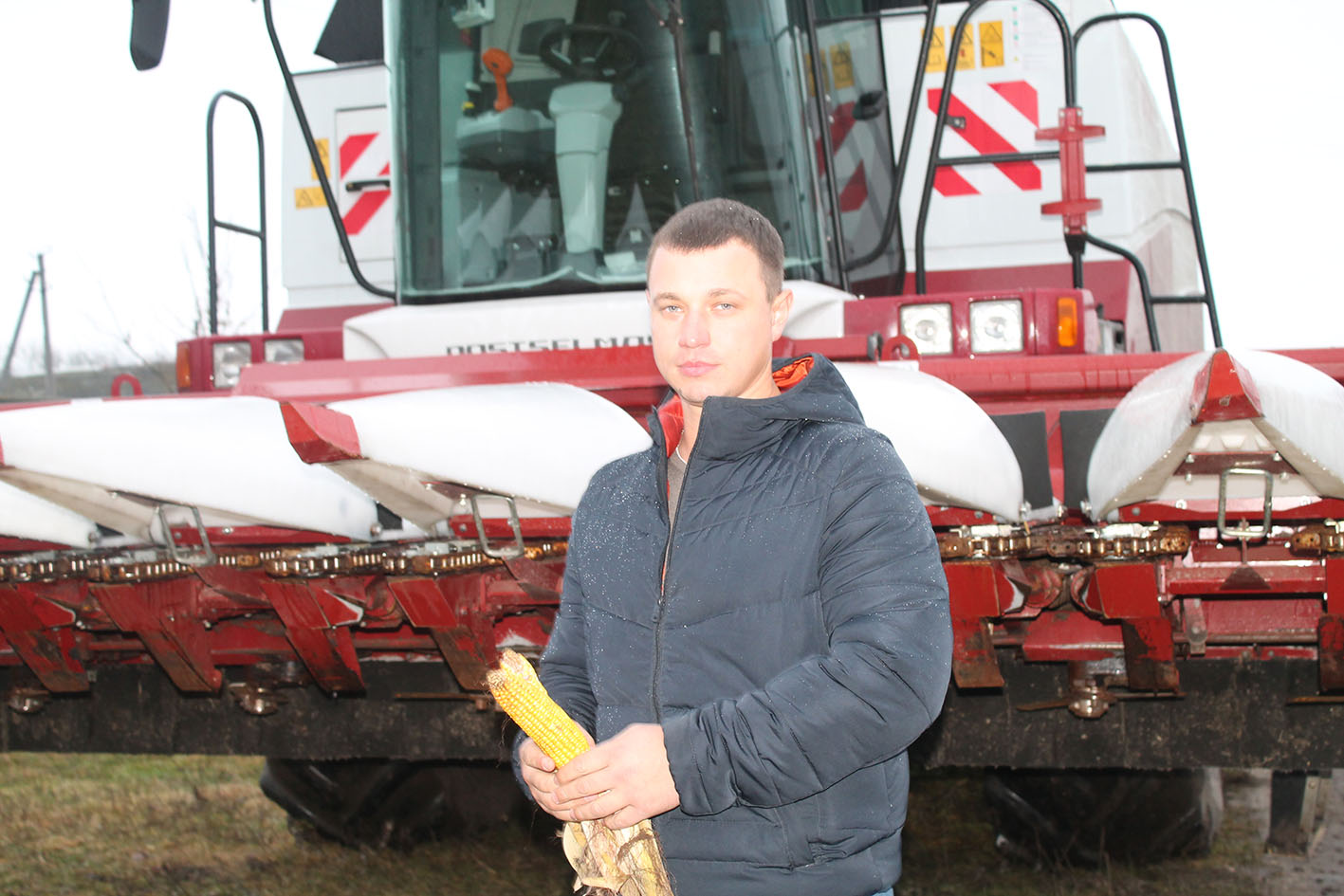 Обмолот кукурузы ведет молодой механик хозяйства Сергей Клочков. Он переоборудовал свой зерноуборочный комбайн специальными комплектами, которые усиливают ряд узлов машины и предохраняют их от повреждения тяжелыми початками.