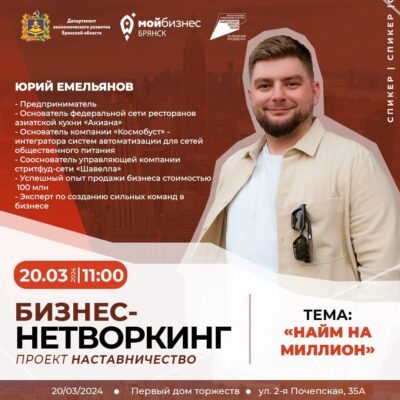 Брянский центр «Мой бизнес» возобновляет проект «Наставничество» и приглашает предпринимателей региона на бизнес-нетворкинг, где будет обсуждаться «Найм на миллион» — система, благодаря которой в бизнес приходят сильные сотрудники. Первая встреча сезона-2024 пойдёт 20 марта в 11:00 (среда) по адресу: Первый дом торжеств, ул. 2-я Почепская, 35а. Мероприятие будет проведено в рамках реализации нацпроекта «Малое и среднее предпринимательство».