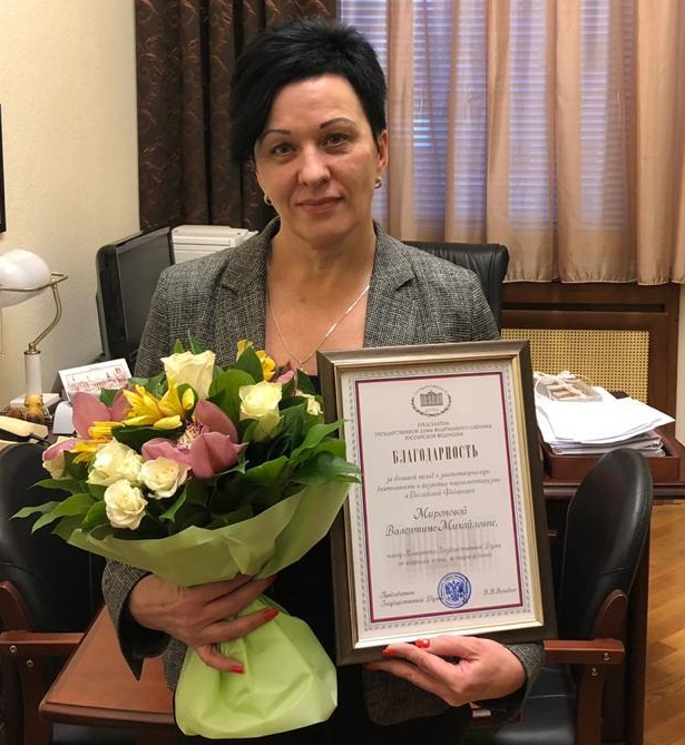 Работа брянского депутата Государственной Думы ФС РФ Валентины Мироновой была отмечена руководством федерального парламента. Председатель российского заксобрания Вячеслав Володин вручил ей благодарность за большой вклад в законотворческую деятельность и развитие парламентаризма в РФ. Напомним, что Валентина Миронова входит в состав думского Комитета по вопросам семьи, женщин и детей. (0+)