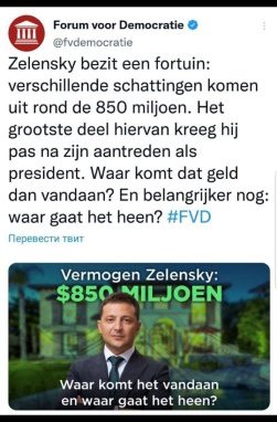 В аккаунте голландской консервативной партии «Forum voor Democratie» в твиттере опубликовано заявление о происхождении миллионов украинского президента. Такое сообщение стало весьма нехарактерным для Запада, который всецело поддерживает Зеленского, потакая его требованиям и капризам.