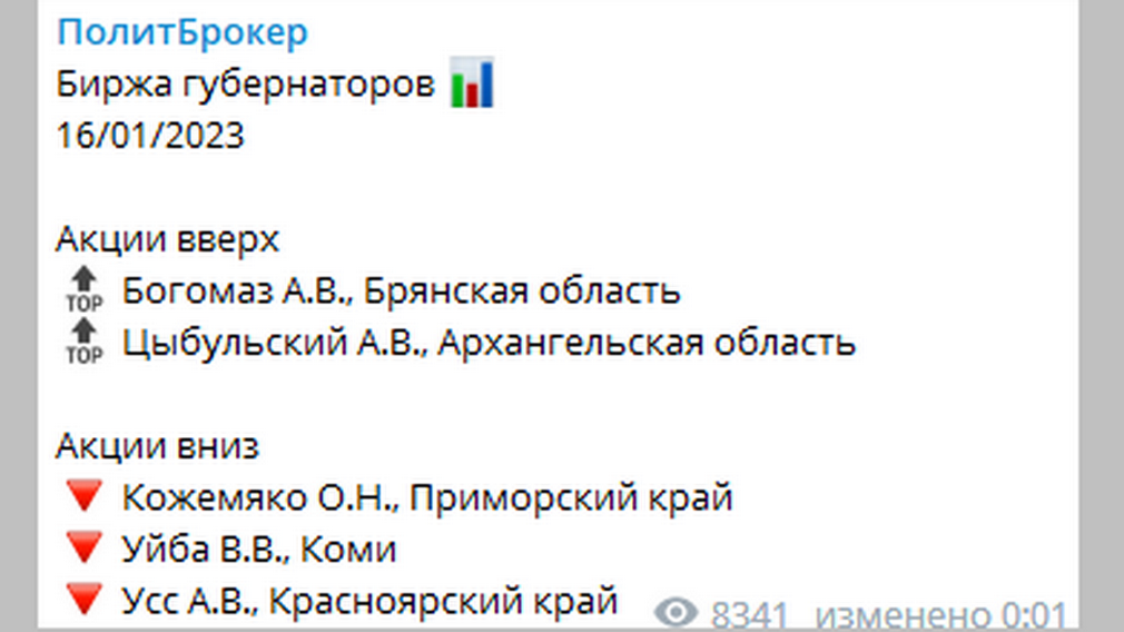 В федеральном ТГ «ПолитБрокер» сообщили о росте позиций брянского губернатора Александра Богомаза на политической бирже. Об этом сообщает РИА «Стрела».