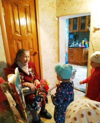 Живет в городе Дятьково Брянской области на улице Качалова Евгения Александровна МАЛАХОВА. Отважная партизанка, участница Парада Победы 2015 года. Воспитанники «Улыбки» вместе с воспитателями Тамарой Кузнецовой и ее воспитанниками из старшей группы, а также с Лилией Роговой (средняя группа) отправились прямо домой к ветерану, чтобы подарить ей цветы, послушать ее рассказ о тех грозных военных годах, прочитать стихи. Сонечка Дудкина и Ксюша Рыженкова из старшей группы прочитали стихи и подарили цветы Евгении Александровне Малаховой.