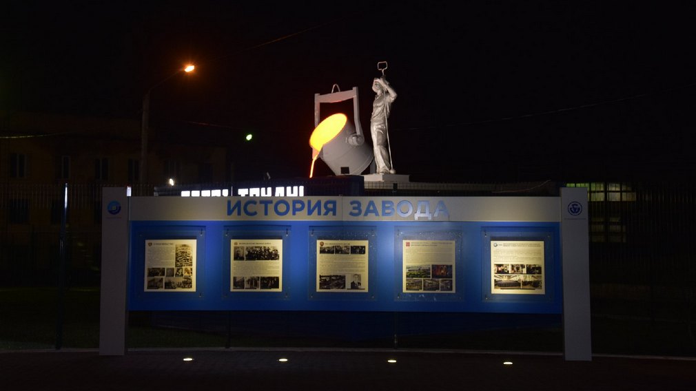 В Брянске на центральной площади перед «Бежицкой сталью» появилась новая инсталляция — рядом со скульптурой сталевара установлен литейный ковш с подсветкой, передающей цвет жидкого металла.