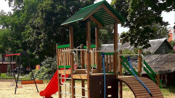 У подъездов домов №7 и №9 по улице Горького смонтировали освещение и установили новые скамейки. На детских площадках установили игровые комплексы с качелями.