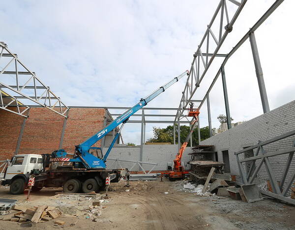 В Фокинском районе Брянске продолжается строительство плавательного бассейна. Сегодня завершается монтаж ферм и параллельно закрепляются элементы кровельной системы.