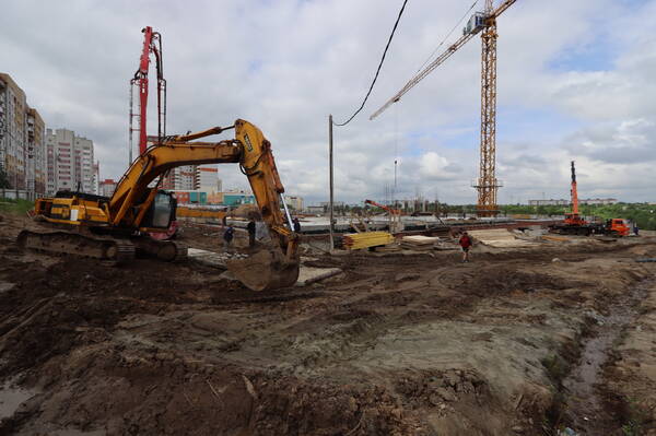 Сейчас уже полностью готов фундамент новой школы, на всех 4-х блок-секциях бетонируются плиты перекрытия 1 этажа и вертикальные конструкции. Каждый день на объекте трудятся около 60 рабочих и 10 единиц техники.