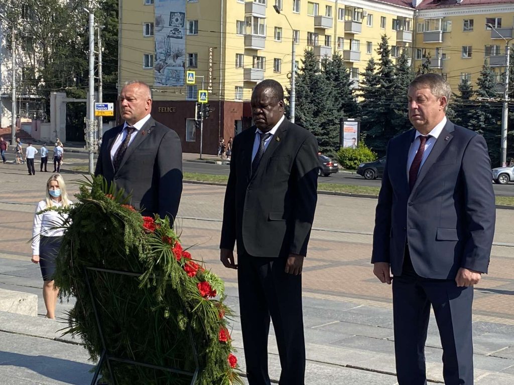 «Брянская Губерния» сообщает, в Брянскую область прибыл посол Уганды Джонсон Агара Олва. Вместе с губернатором Александром Богомазом и председателем облдумы Валентином Субботом он возложил цветы к Вечному огню на Площади партизан.