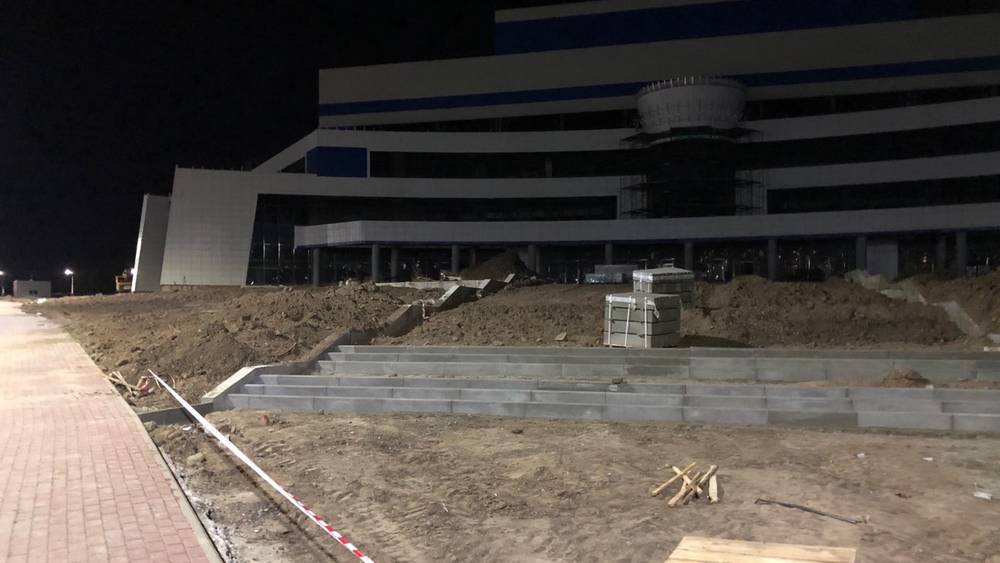 Вдоль дороги проложили тротуар из плитки, от него к спортивному сооружению будут вести удобные лестницы. Одновременно готовятся газоны.