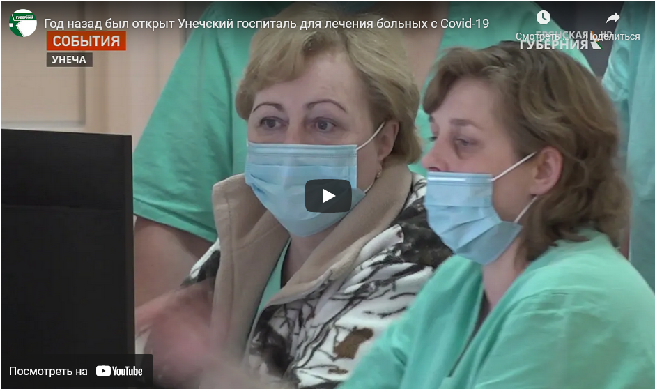 Унечский госпиталь для лечения больных с Сovid-19 был открыт 8 декабря 2020 года. Как сообщает «Брянская губерния», с 1938 по 2014 гг. это здание было больницей для железнодорожников.