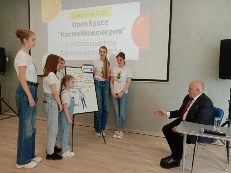 Воспитанницы представили проект «Космо-тренд», т.е.создание экипировки для космонавтов с использованием экологичных и биоразлагаемых материалов. Проект представили Виктору Михайловичу. Он рассказал о тканях, используемых для одежды космонавтов в настоящее время.