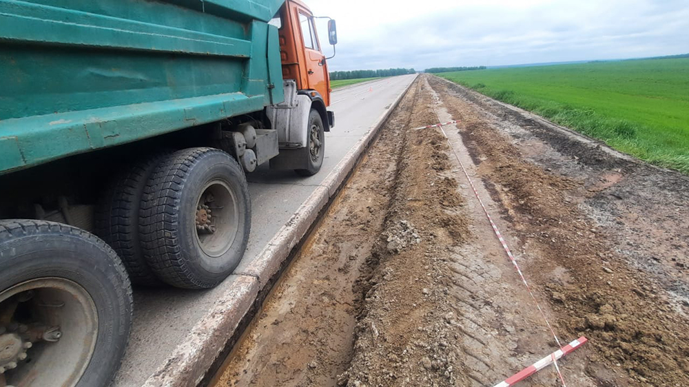 ПСпециалисты подрядной организации «Брянскавтодор» расширяют проезжую часть, выполняют отсыпку песчано-щебеночной смесью. Затем двухслойный асфальт уложат поверх базальтовой геосетки.