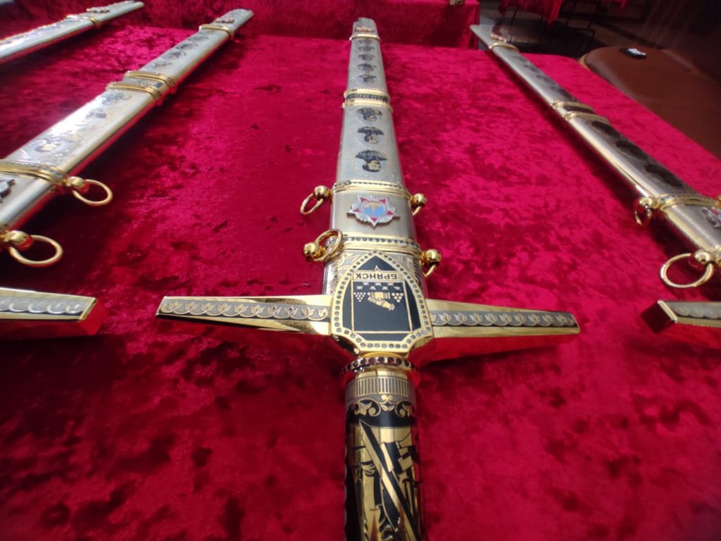 Мечи изготовлены вручную южно-уральскими мастерами (Златоустовская оружейная компания) и соответствуют государственному стандарту клинкового оружия. Клинок из знаменитой златоустовской стали украшен растительным орнаментом и дарственной надписью для каждого награждаемого города. На другой его стороне высечена цитата Александра Невского: «Кто с мечом к нам придет, тот от меча и погибнет». На цельнометаллических ножнах искусно выгравированы портреты русских полководцев.