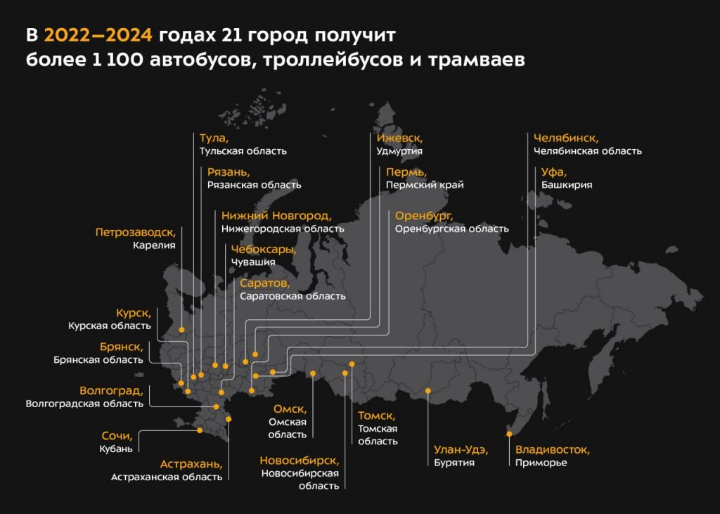 Минтранс России утвердил перечень городов, которые прошли конкурсный отбор на обновление подвижного состава. В ближайшие 3 года современные и экологичные машины поступят в 21 российский город, в том числе и в Брянск. На эти цели направят порядка 10 млрд рублей.