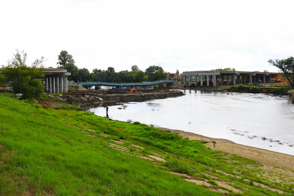 Сейчас на стороне улицы Калинина строители подрядной организации ООО «Мостремстрой» продолжают бетонировать подпорную стенку под переправой. Техника работает на месте будущих русловых опор. Всего в основание моста забетонируют 12 опор: 9 уже готовы, оставшиеся 3 построят в реке Десне.