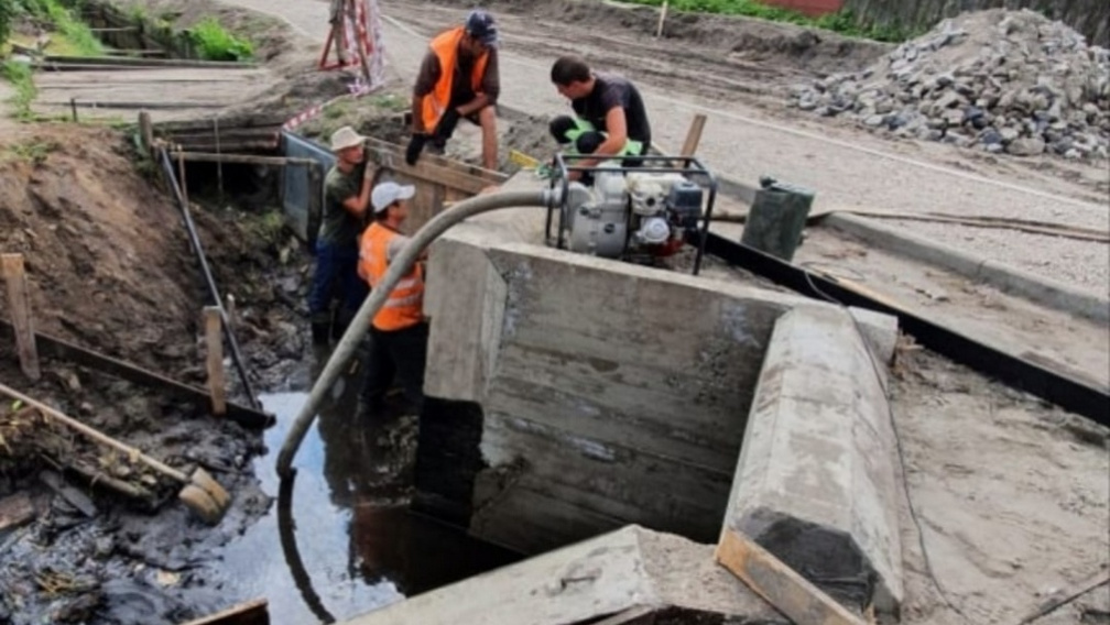 Работы осложняются тем, что дорога проходит через участок, где протекает ручей.