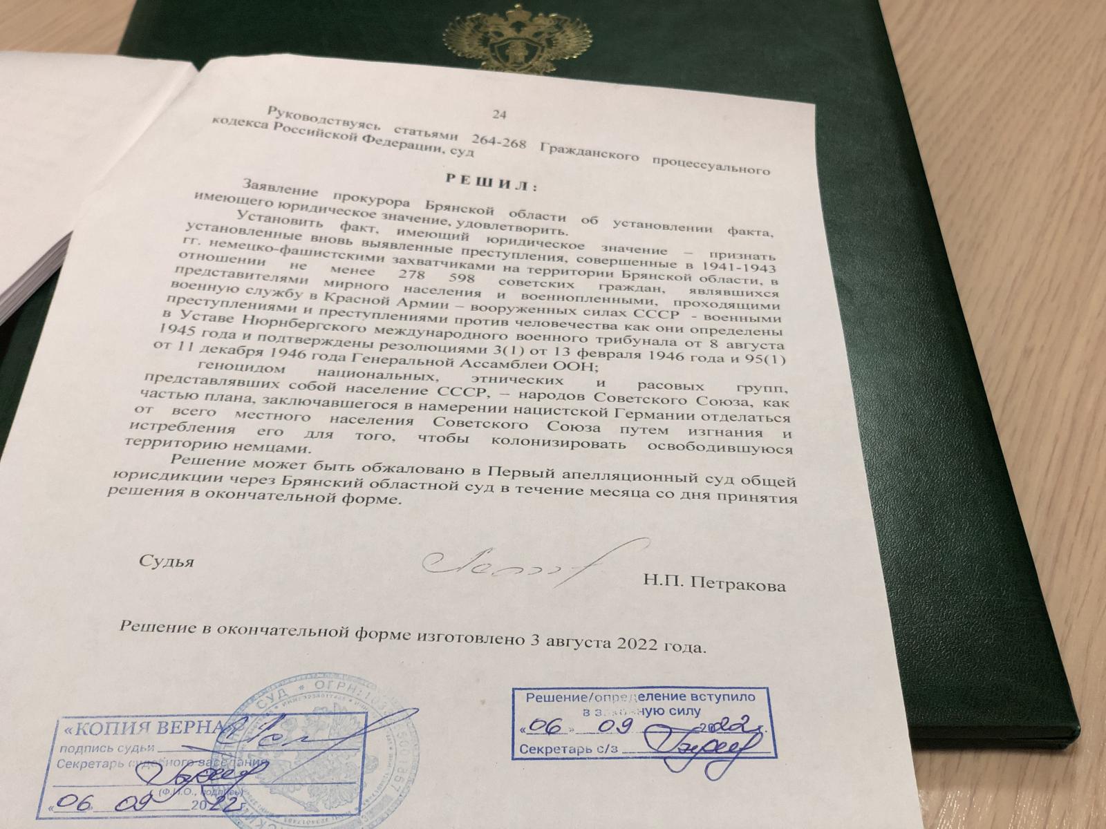 Преступления немецко-фашистских захватчиков на оккупированной территории Брянской области в период с августа 1941 года по сентябрь 1943 года признаны военными преступлениями, преступлениями против человечности и геноцидом народов Советского Союза. Заявление было подготовлено и направлено в суд по поручению Генерального прокурора РФ Игоря Краснова. Участие по делу принимал прокурор области Александр Войтович.