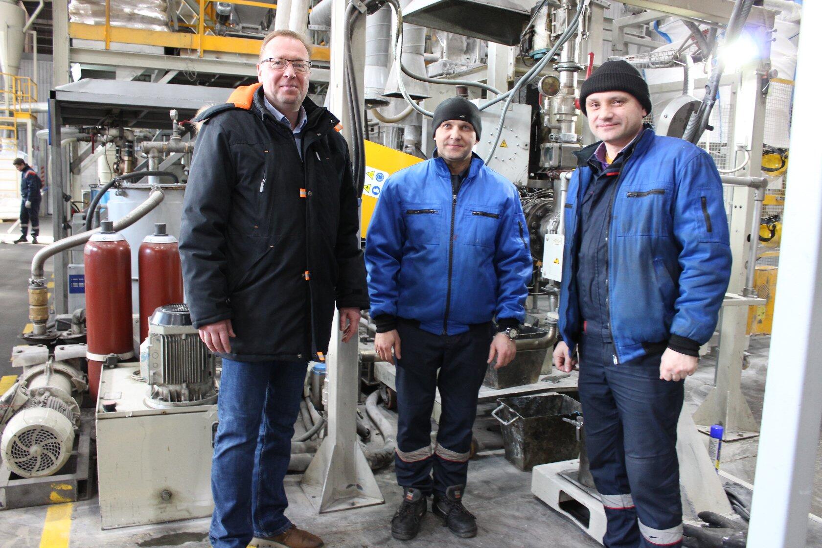 Беседовала ЕЛЕНА БАРАНОВА. Фото автора. На снимке: Р.А. Попов, мастер цеха С.А. Маслов, машинист экструдера Р.С.Потапов.