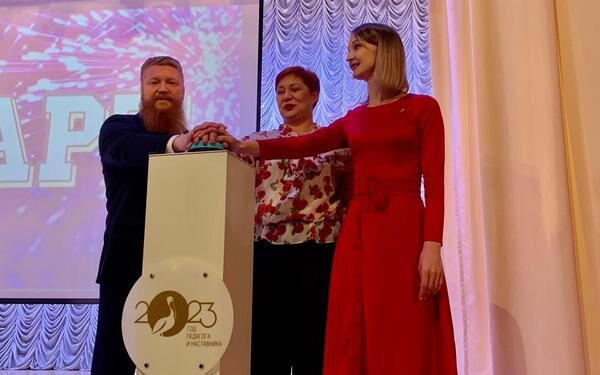 Вместе с учителем начальных классов средней школы села Красновичи Унечского района, победителем регионального этапа Всероссийского конкурса «Учитель года — 2022» Ольгой Викторовной Приваловой, которая тоже поднялась на сцену, все трое почётных гостей дали старт Году педагога и наставника, нажав на импровизированную кнопку «Старт».
