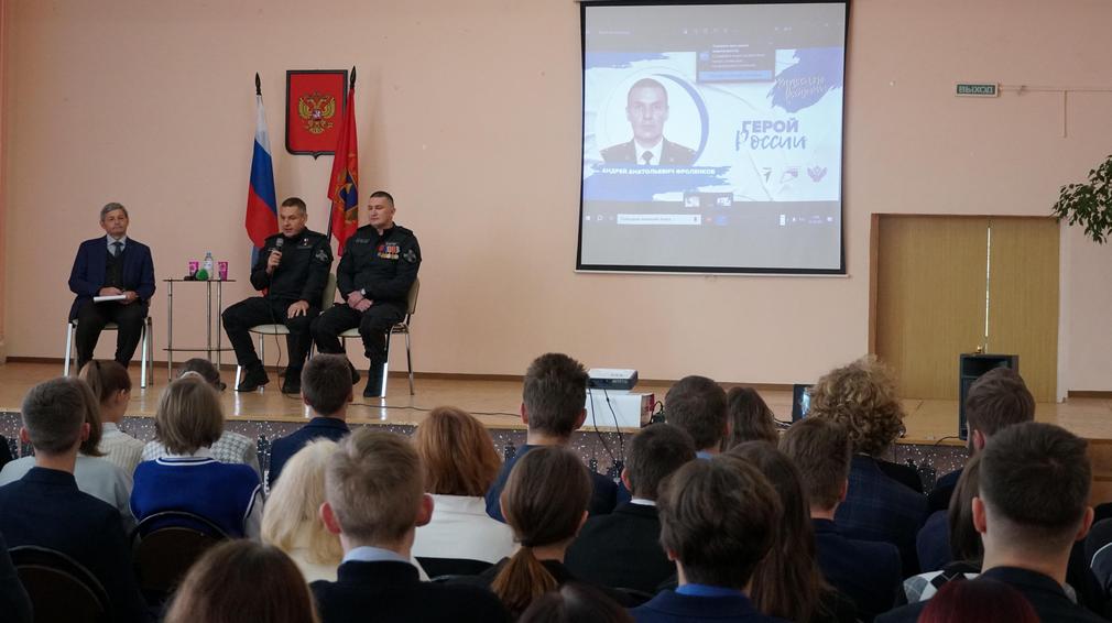 В Брянске Герой России, полковник полиции Андрей Фроленков и офицер ОМОН «Арсенал» Евгений Ж. встретились с учениками школы №17.