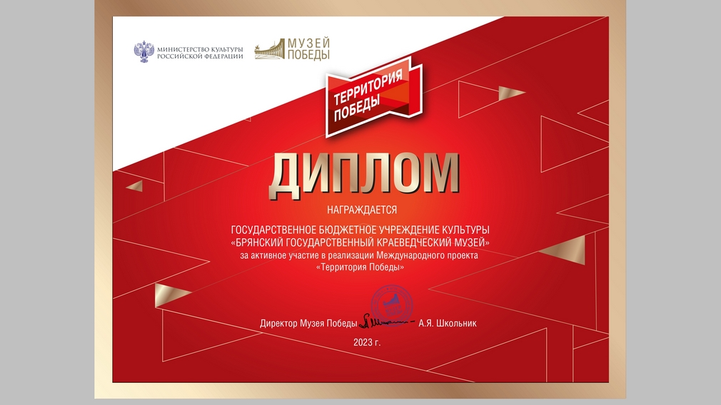 Как сообщает РИА Стрела, директор Музея Победы наградил Брянский государственный краеведческий музей дипломом. Награду учреждение культуры получило за участие в международном проекте «Территория Победы».