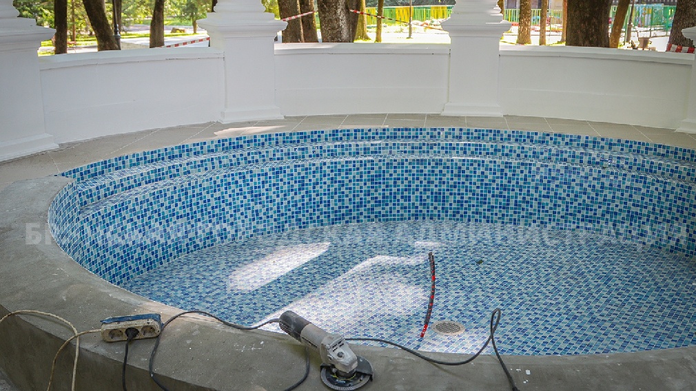 Завершили свою работы штукатуры, покрашены колонны, а в чаше фонтана сделана укладка плитки и мозаики.