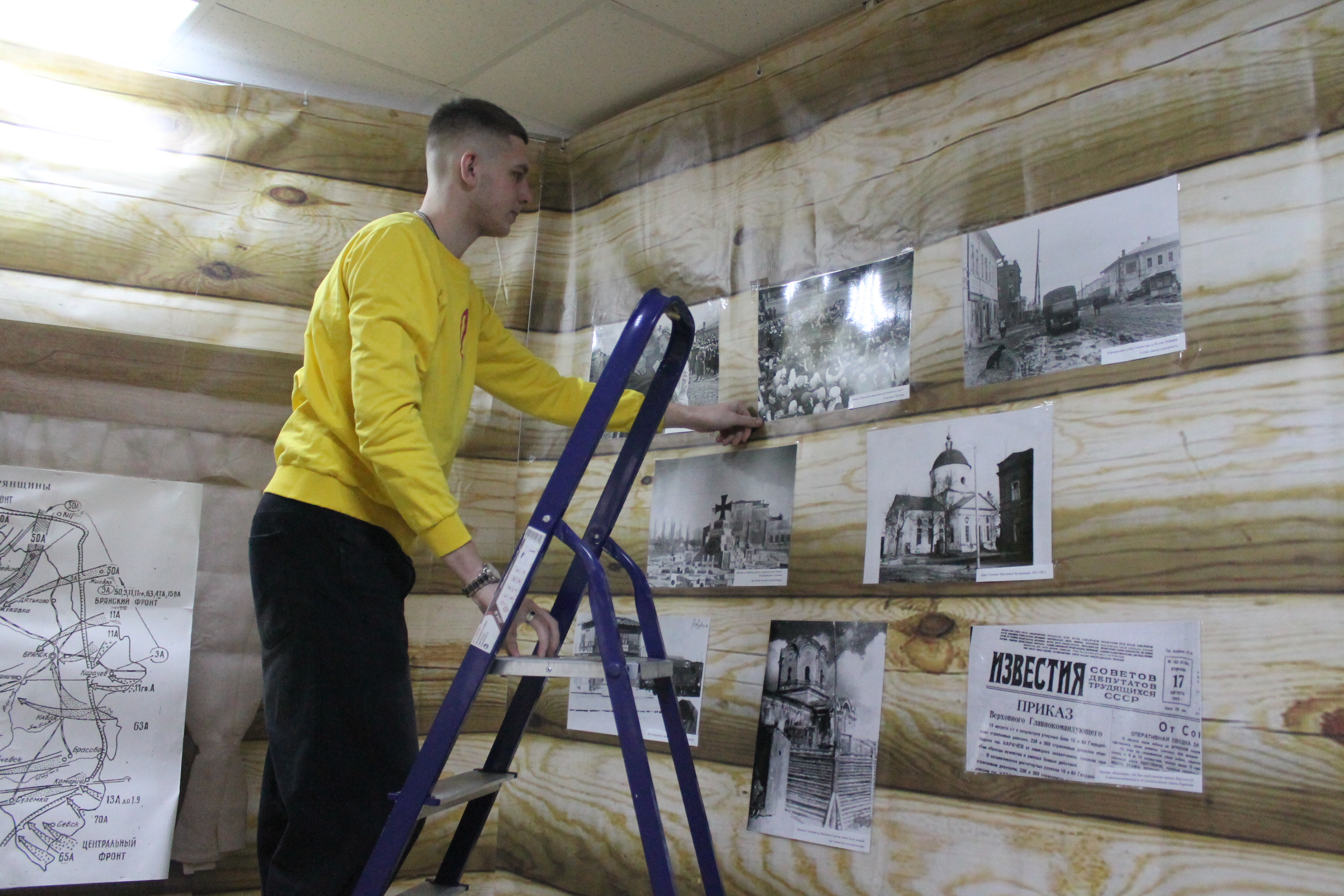 На нем — юбилейная цифра, изображение Георгиевской ленточки, скульптуры «Родина-мать зовет!». Творческий коллектив тщательно продумал композицию, которая размещена в глубине фойе. Там размещены в основном подлинные предметы солдатского обихода: каски, гильзы, затвор от автомата, шинель…Впечатляет своим видом противотанковый «ёж». Фоном служит экспозиция трогательных фотографий военных времен, на которых