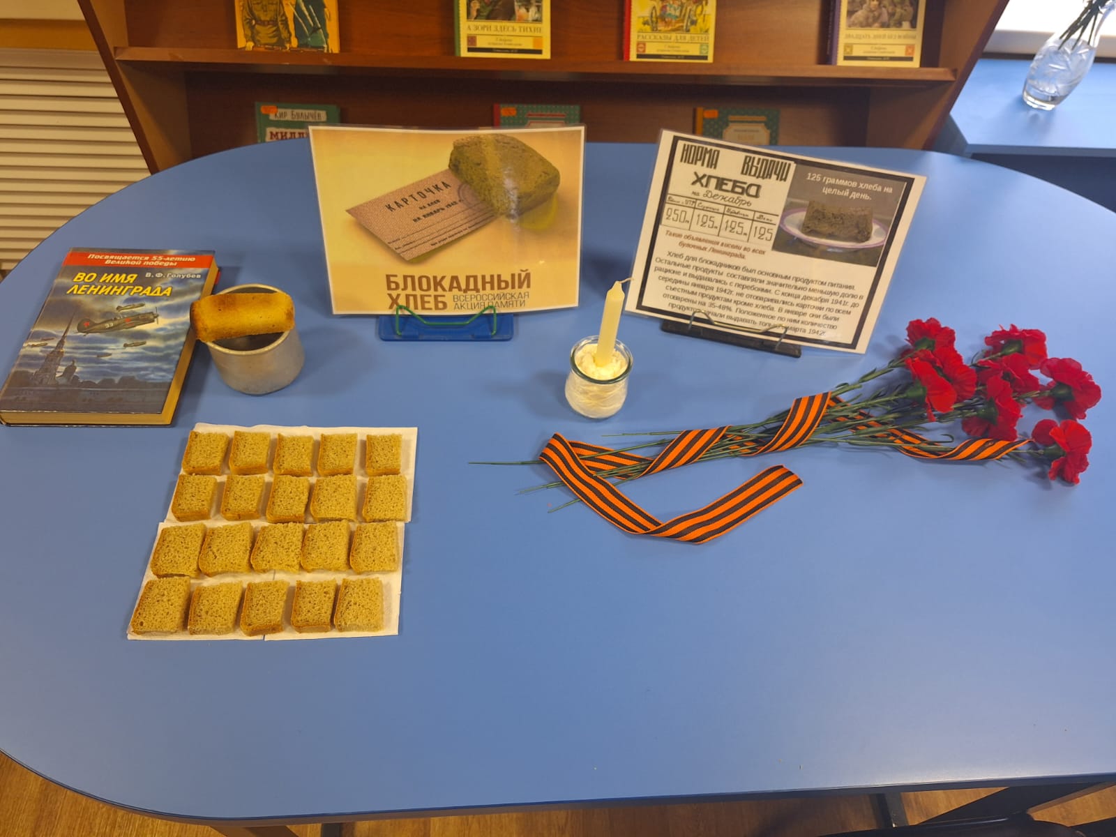 Вниманию учащихся была представлена выставка — инсталляция «Блокадный хлеб».