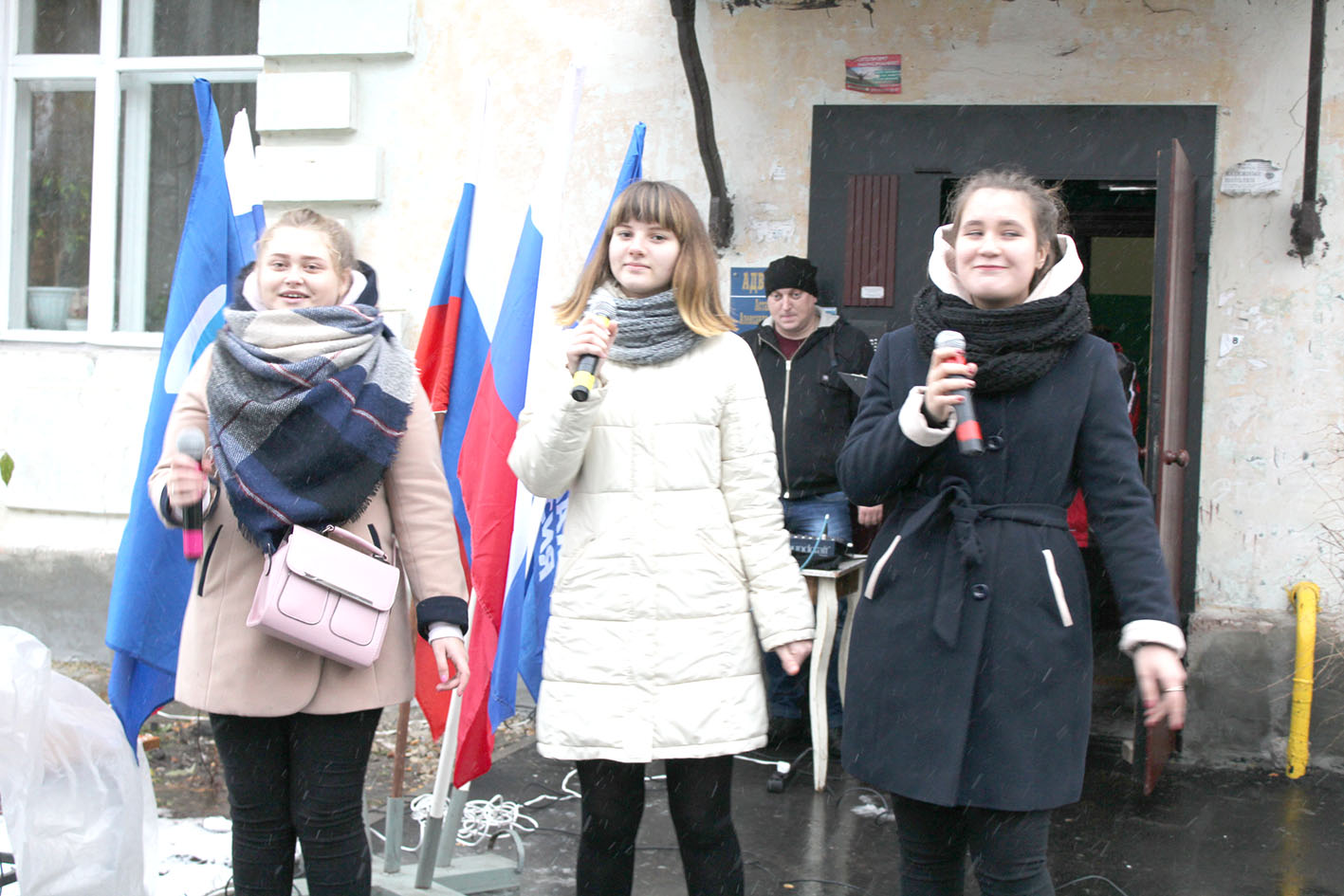 Несмотря на то, что в этот день выпал первый снег и было довольно прохладно, это не помешало состояться радостному событию. Поздравить жителей пришли глава райадминистрации Л.В.Лужецкая, глава города Ю.А.Братяков, региональный представитель общественного движения «Общероссийский народный фронт» А.И Клюев и другие.