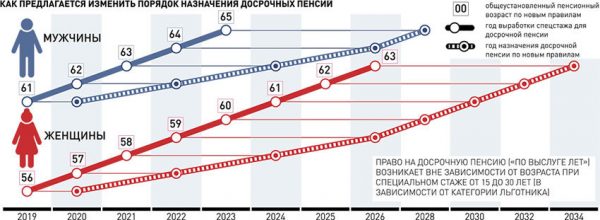 «Новый возраст выхода на пенсию будет исчисляться исходя из даты выработки специального стажа и приобретения права на досрочную пенсию, — уточнили в минтруде. — Сейчас данным категориям работников необходимо выработать специальный стаж длительностью от 15 до 30 лет в зависимости от конкретной категории льготника. Таким образом, возраст, в котором эти работники вырабатывают специальный стаж и приобретают право на досрочную пенсию, фиксируется, а реализовать это право (назначить «досрочную» пенсию) можно будет в период с 2019 по 2034 год и далее с учетом увеличения трудоспособного возраста и переходных положений».